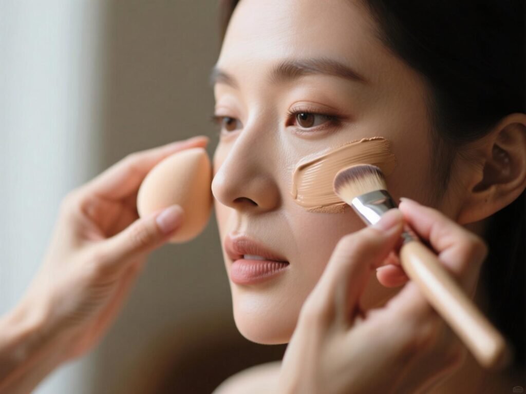 - الدمج بالأدوات الصحيحة: استخدمي إسفنجة مبللة للبشرة الجافة، وفرشاة مسطحة للبشرة الدهنية.
